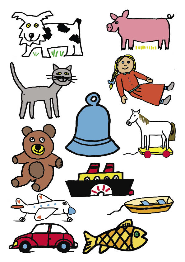 obrázky 1 a dog, a pig, a cat, a doll, a bell, a teddy, a ship, a boat, a plane, a car, a fish |