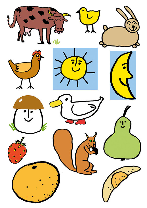 obrázky 2 a cow, a chicken, a hen, a rabbit, a duck, the sun, the moon, a mushroom, a strawberry, a squirrel, a pear, an orange, a roll |