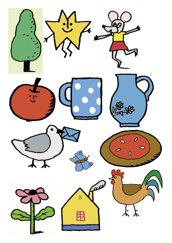 obrázky 3 a tree, a star, a mouse, an apple, a mug, a jug, a pigeon, a cake, a rooster, a house, a flower, a butterfly |